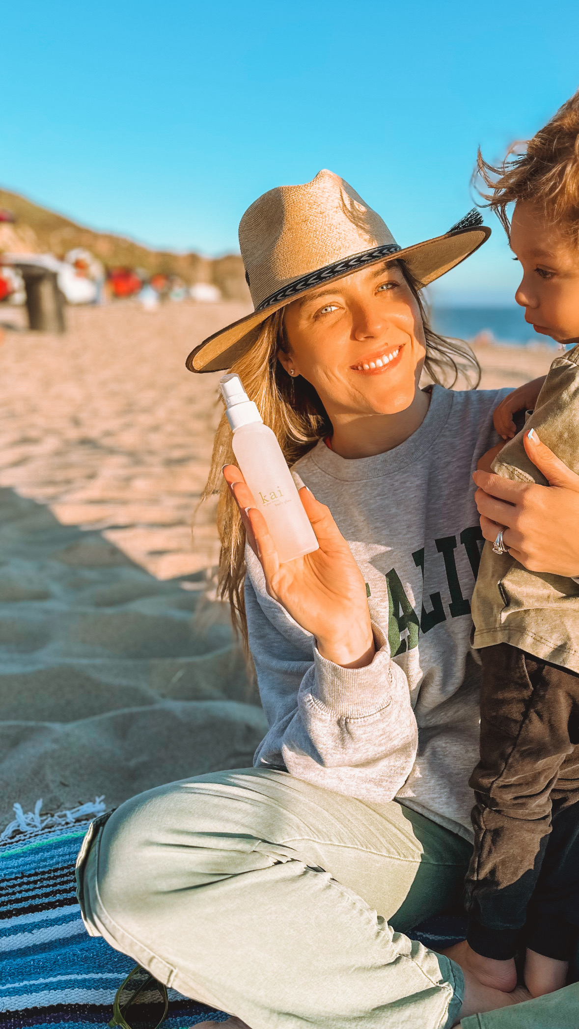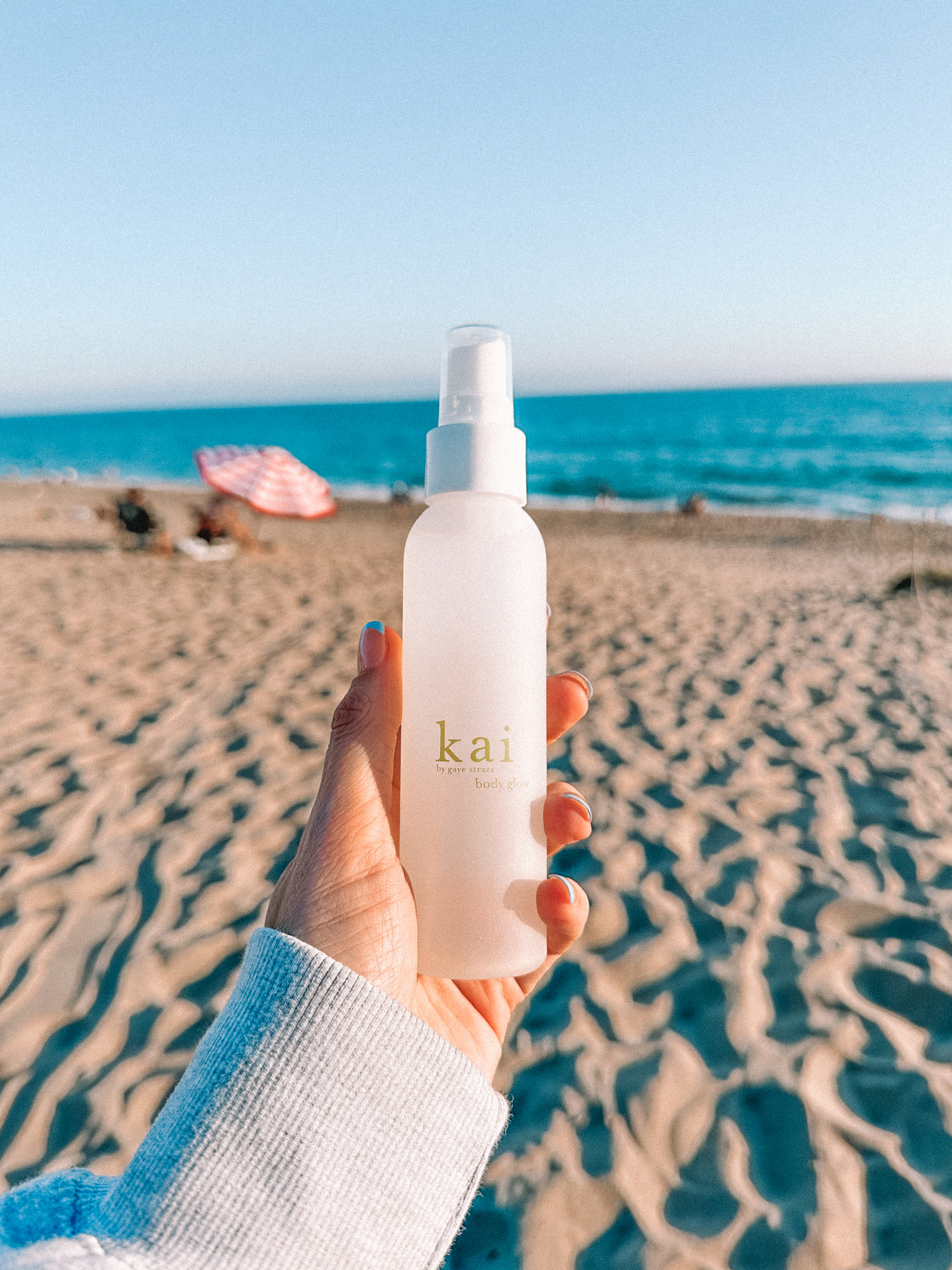as a mom in my thirties, i keep things natural and simple. let your hair air dry as often as possible, wear sunblock, and choose pure, clean products and of course the kai body glow!
