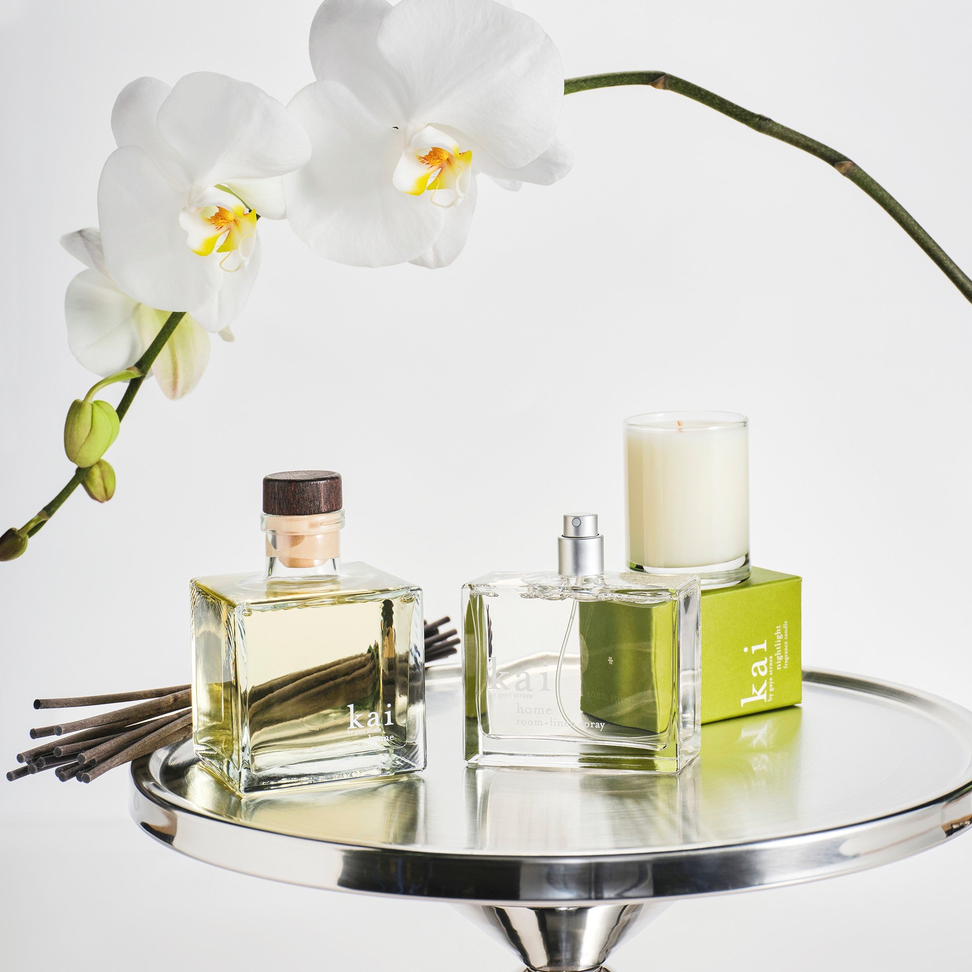kai for the home. this set includes the room-linen spray, reed diffuser, and nightlight candle to fill every space with the clean, fresh scent of kai. the perfect gift for hosts, homes, and holiday gatherings.